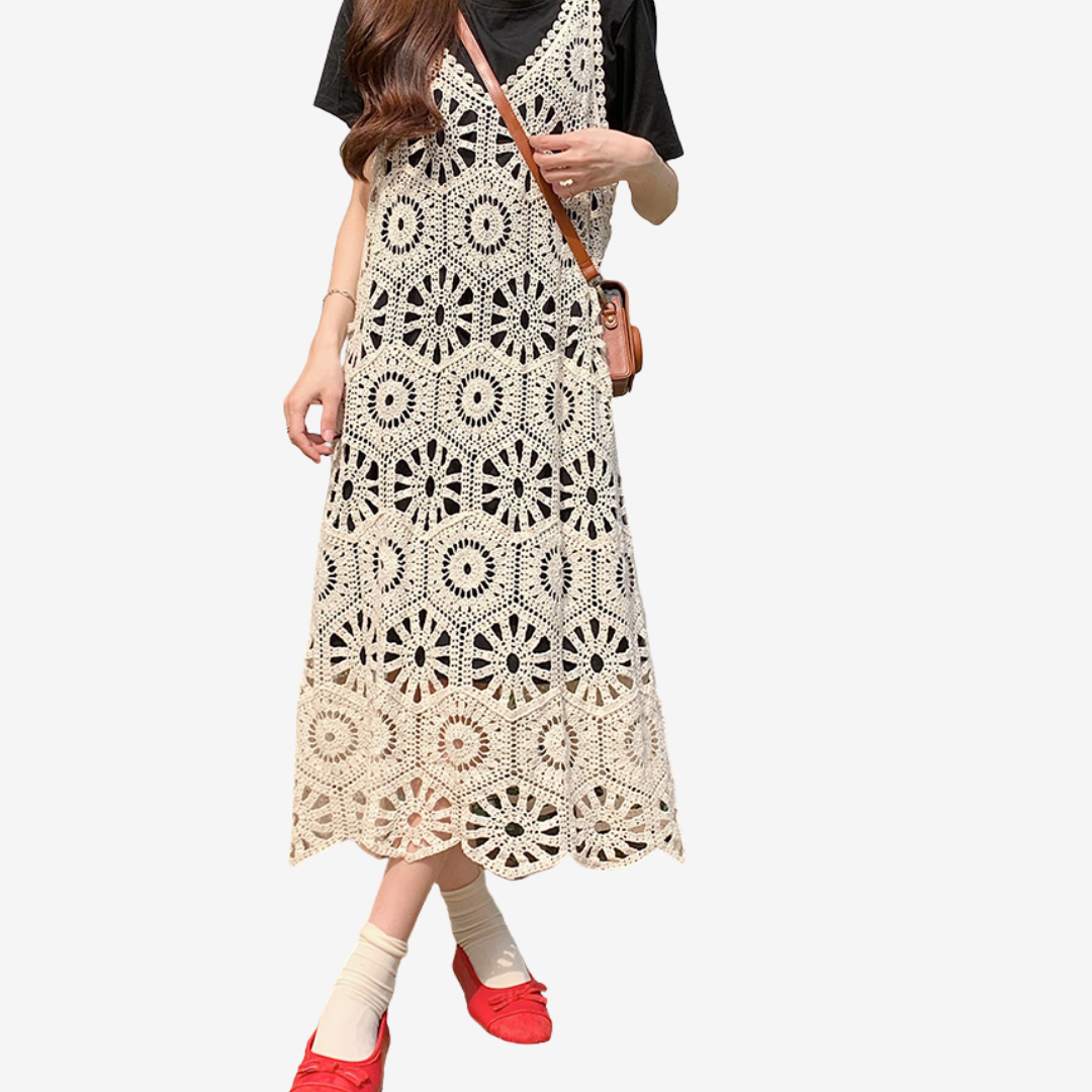 Sublimez votre garde-robe estivale avec la Célista™, une robe en maille sans manches à l'allure bohème chic et aérienne, idéale pour les journées à la plage ou les dîners au coucher du soleil. Confectionnée en coton mélangé semi-transparent, cette pièce légère arbore des détails ajourés raffinés qui lui confèrent une allure séduisante tout en laissant la brise marine caresser votre peau. Sa coupe décontractée et son décolleté en V en font un vêtement idéal pour couvrir votre maillot de bain ou comme seconde couche par-dessus votre tenue habituelle.