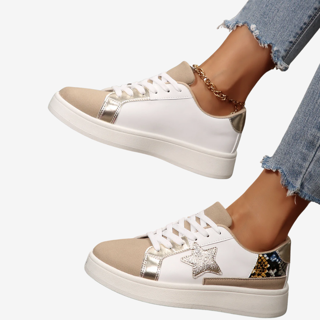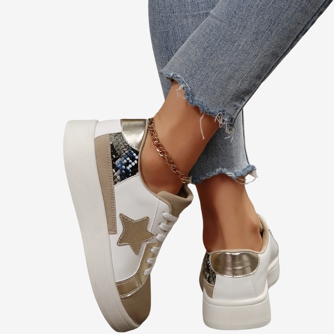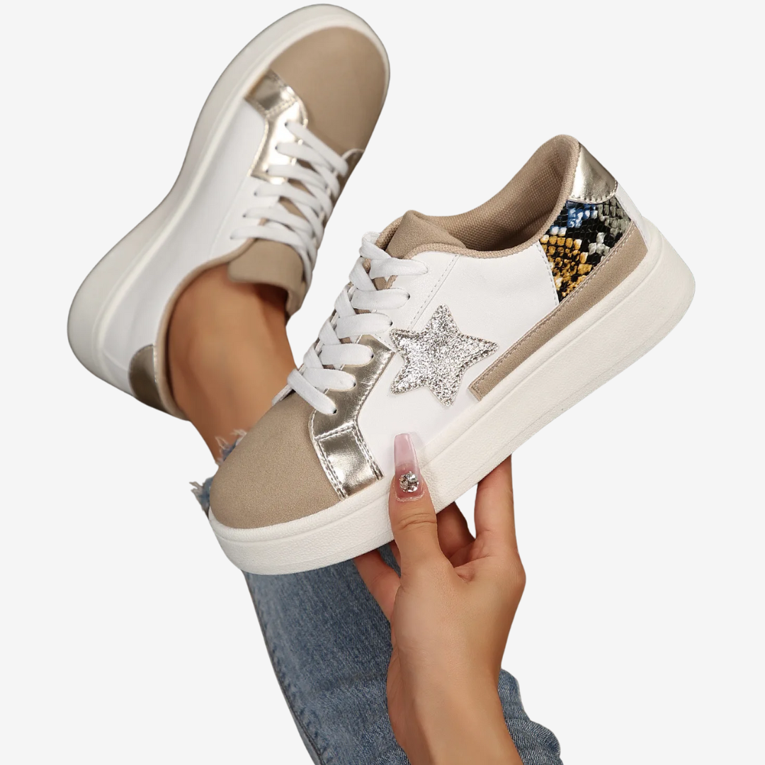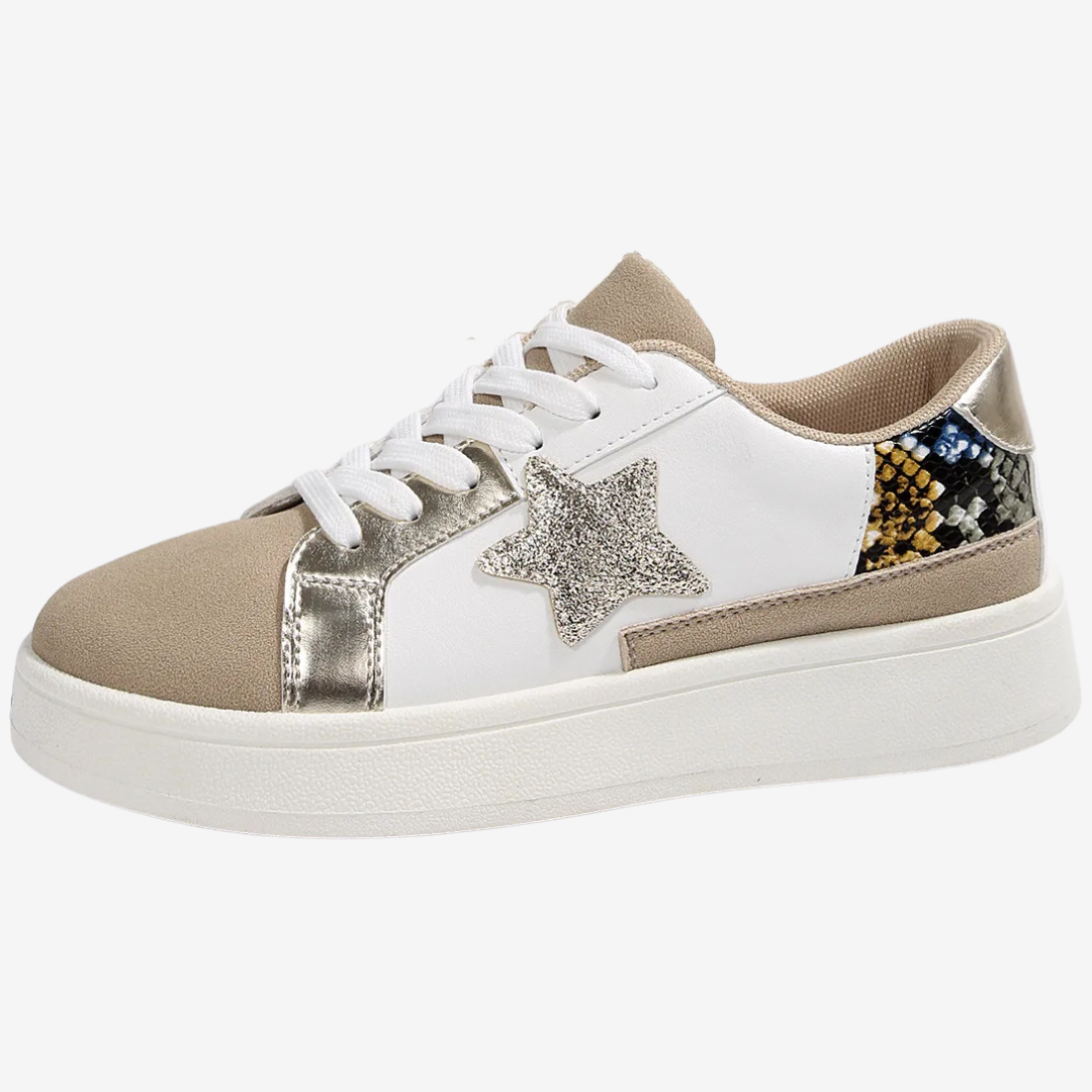 Les baskets Nadège™ allient design audacieux et confort au quotidien. Ornées d'un motif python doré saisissant rehaussé d'une étoile bronze, ces baskets à lacets ajoutent une touche glamour à toutes vos tenues. L'harmonie des textures et des couleurs leur confère un design raffiné et accrocheur.
