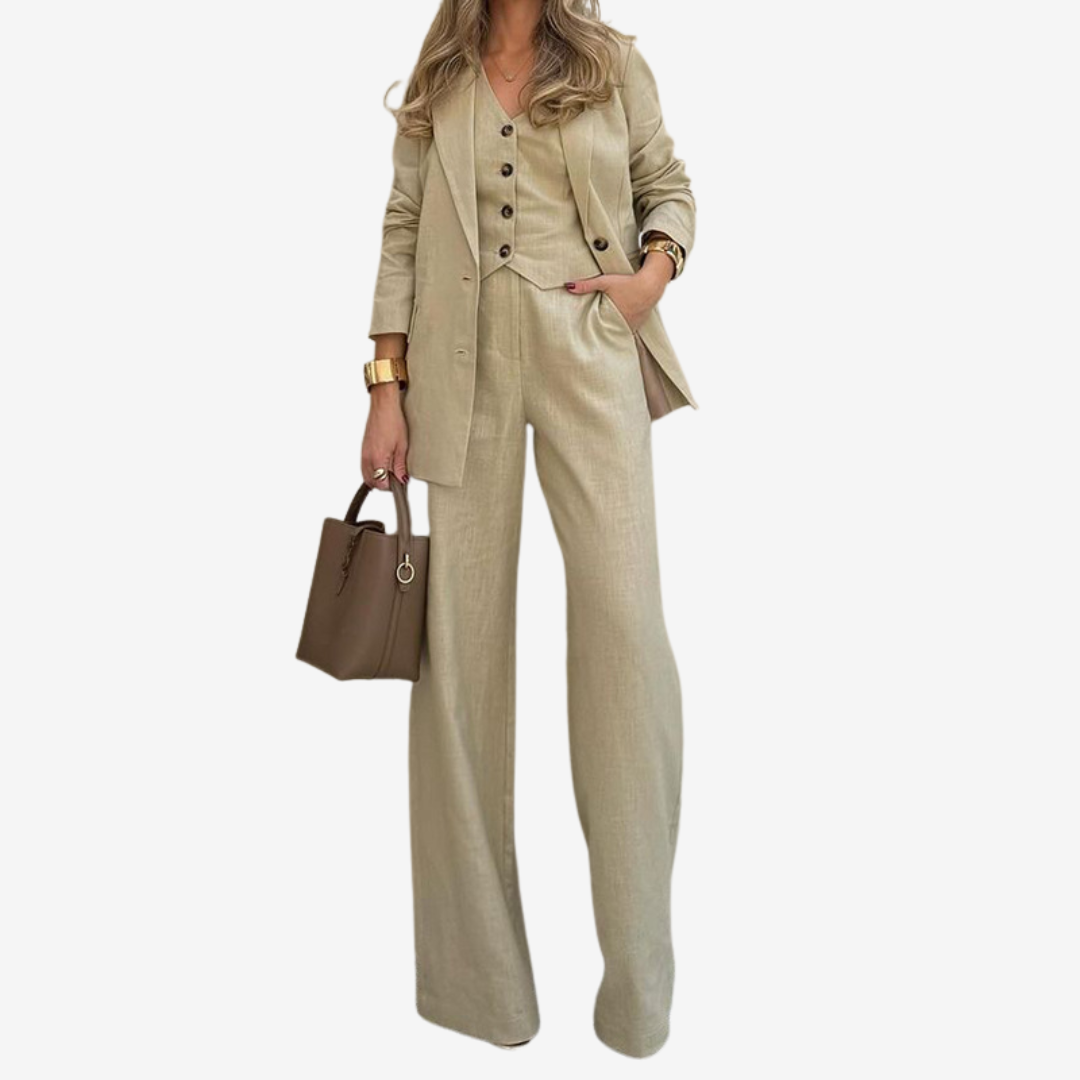Découvrez Ninette™, l'incarnation du chic parisien. Cet ensemble trois pièces associe un élégant blazer ajusté, un gilet boutonné et un pantalon large taille haute. Ses tons beiges doux rehaussent son style intemporel, tandis que son tissu léger épouse la silhouette pour une sophistication décontractée. Polyvalent pour les réunions d'affaires, les brunchs élégants ou les balades en ville, ce costume s'adapte à votre journée : il vous suffit de changer de chaussures et d'accessoires.